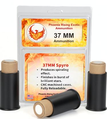 3 Round Pack – 37mm Spyro Live Ammo. Blue Bees 37mm signaling round produce a spiraling effect and finish with a burst of stars when launched.